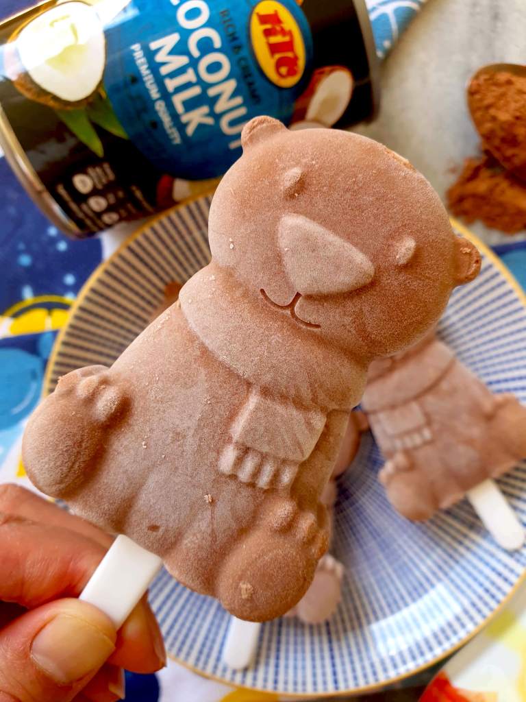 To give a deep cacao flavour, I love to use organic cacao powder. As you already probably know, cacao is one of the richest sources of polyphenols, especially flavonoids that play a big role in reducing inflammation and reducing cholesterol levels. So I guess these popsicles can be though of as immune boosting chocolate bear popsicles….I want another one now!