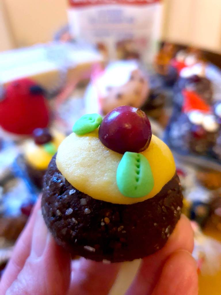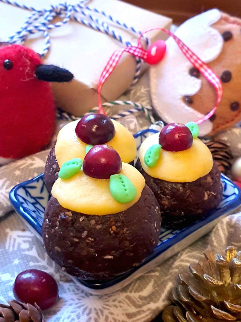- Yellow marzipan. Pinch off a blob of marzipan from the pack. Roll into a ball. Flatten into a disc using your fingers, but not too thin to emulate thick pouring custard. Place on top of the energy ball and press down to secure.