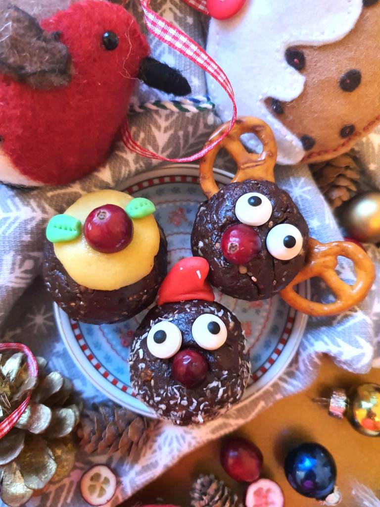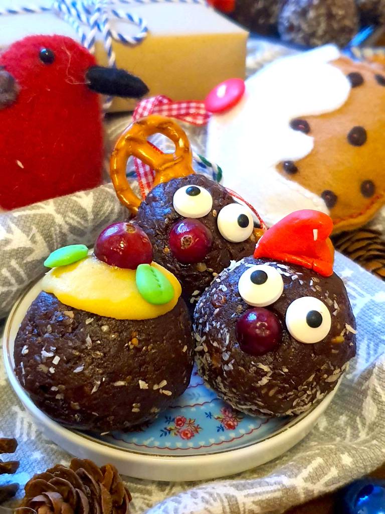 I have made some for the festive table and also some as gifts (just pop in a jar with some ribbon and a tag). These treats are also easy to make; all you need to do is blend the fruit and nuts and roll. There is no baking required. The fun bit really is in the decorating. It’s almost like playing with plasticine when you were a kid!